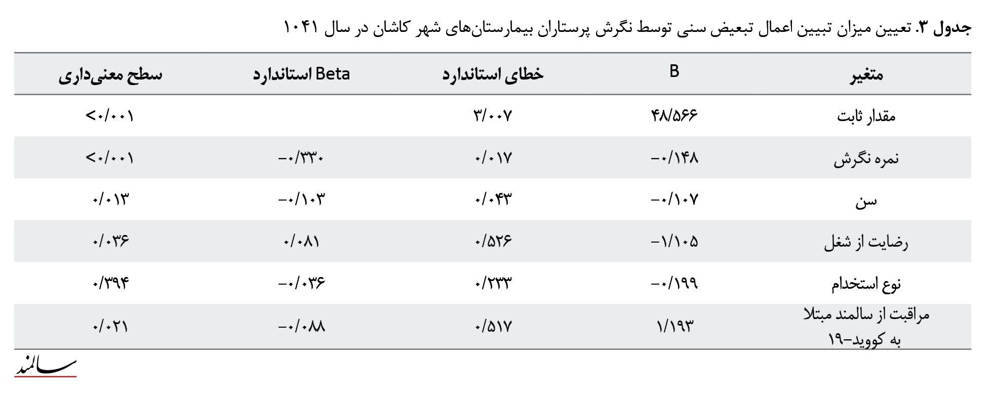 جدول شماره 3 نشان میدهد بهجز متغیر نوع استخدام، بقیه متغیرها شامل نمره نگرش (0/001>P)، سن (0/013=P)، رضایت از شغل (0/036=P) و مراقبت از سالمند مبتلا به کووید-19 (0/021=P) پیشبینیکننده رفتارهای تبعیضآمیز پرستاران در مورد سالمندان میباشند.