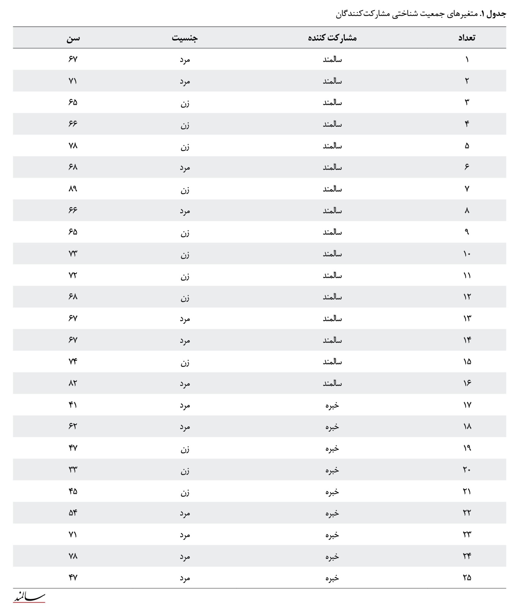 میانگین سنی سالمندان 71 سال و میانگین سنی خبرگان 53 سال بود (جدول شماره 1) .