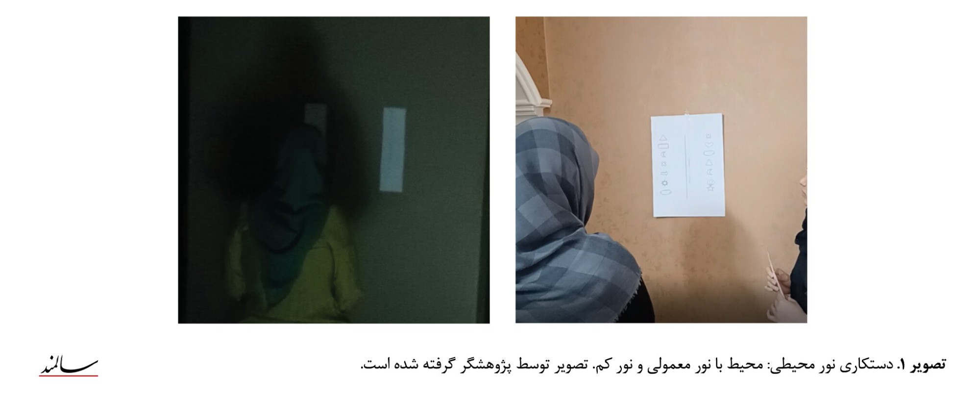 چارت حساسیت کنتراست، شامل یکسری تارگت است که هر تارگت از خطوط تیره موازی در یکی از 3 جهت راست، چپ و بالا تشکیل شده است که درزمینه خاکستری قرار دارند و کنتراست بین خطوط موازی و زمینه بهتدریج کاهش مییابد تا زمانی که تشخیص جهت خطوط برای بیمار مشکل شود. پس از ارزیابی حساسیت کنتراست بیماران، شماره آخرین هدفی که فرد در هر ردیف مشاهده کرده ثبت شد. آزمون حساسیت کنتراست نزدیک و در 2 شرایط نوری متفاوت نرمال و کاهشیافته که توسط نورسنج ارزیابی شده بود، انجام شد (تصویر شماره 1).