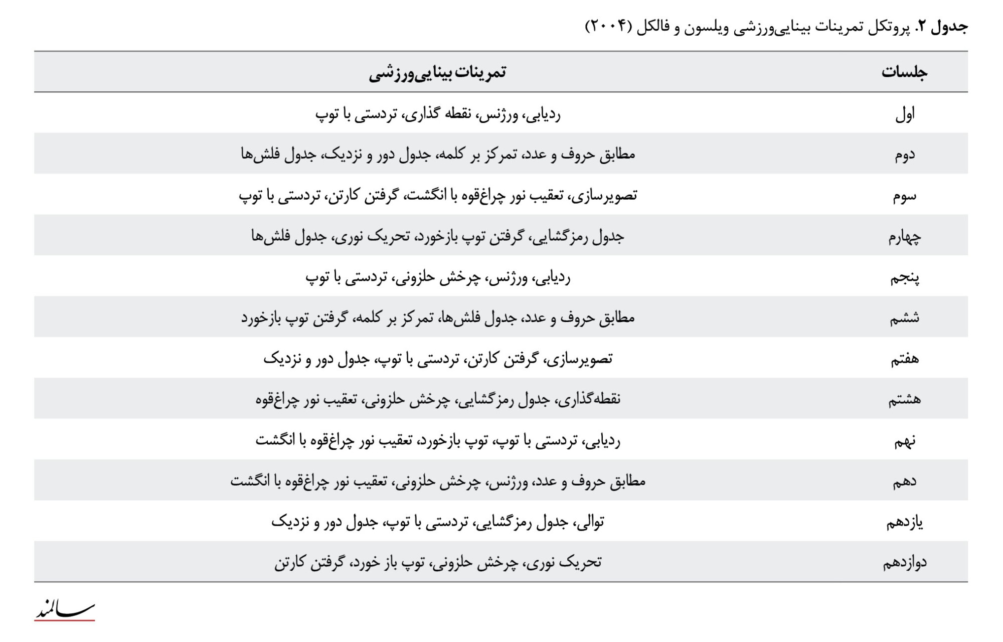 تمرینات بیناییورزشی براساس تمرینات بیناییورزشی ویلسون و فالکل (2004) طبق جدول شماره 2، برای گروه آزمایش 1 در نور معمولی و برای گروه آزمایش 2 در نور کم انجام شد. شرایط محیطی و نوری برای گروه آزمایش 1 به این شکل بود که در اتاقی با نور معمولی تمرین میکردند و هیچ دشواریای در دریافت اطلاعات بینایی برای افراد وجود نداشت. شرایط نور محیطی گروه آزمایش 2 به این شکل بود که پنجره اتاق با پرده بسیار ضخیم پوشیده شده بود و از 2 عدد آباژور دستساز با لامپ 12 وات استفاده شد که توسط صفحهای کدر نور آنها فیلتر شده بود. درجه نور طوری بود که نور در محیط کاهش یافت، اما فرد توانایی دیدن داشت به این صورت نبود که بینایی کامل حذف شود. کلیه تمرینات و آزمونها در فاصله زمانی 7 صبح تا 16 عصر انجام شد و گروه کنترل بدون تمرین این 8 هفته (24 جلسه) را سپری کردند. پس از مداخلات تمرینی انجامشده پرسشنامه ترس از افتادن مجدداً تکمیل شد و پس از اتمام جلسات تمرینی، آزمونهای تعادلی تییوجی و برگ در شرایط نور معمولی و نور کم از هر 3 گروه گرفته شد و اطلاعات ثبت شد.