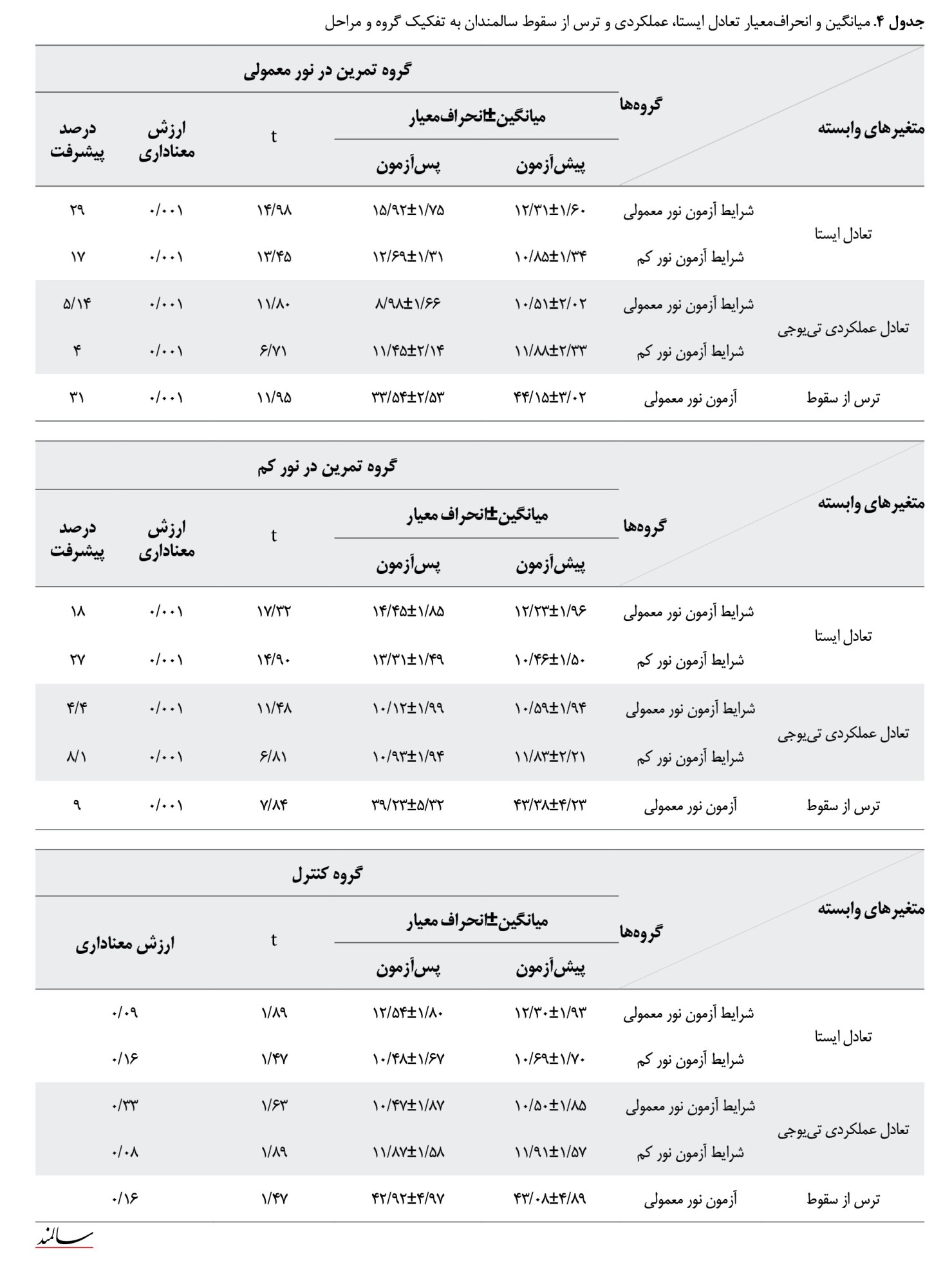 (37,2)=18/57) معنادار بود. نتایج آزمون تی وابسته نشان داد (جدول شماره 4) در نور کم تمرینات بیناییورزشی در هر دو گروه تمرین در نور کم و تمرین در نور معمولی باعث بهبود تعادل عملکردی سالمندان شد، اما درصد پیشرفت در گروه نور کم (8/1 درصد) بیشتر ار درصد پیشرفت در گروه نور معمولی (4 درصد) شده بود.