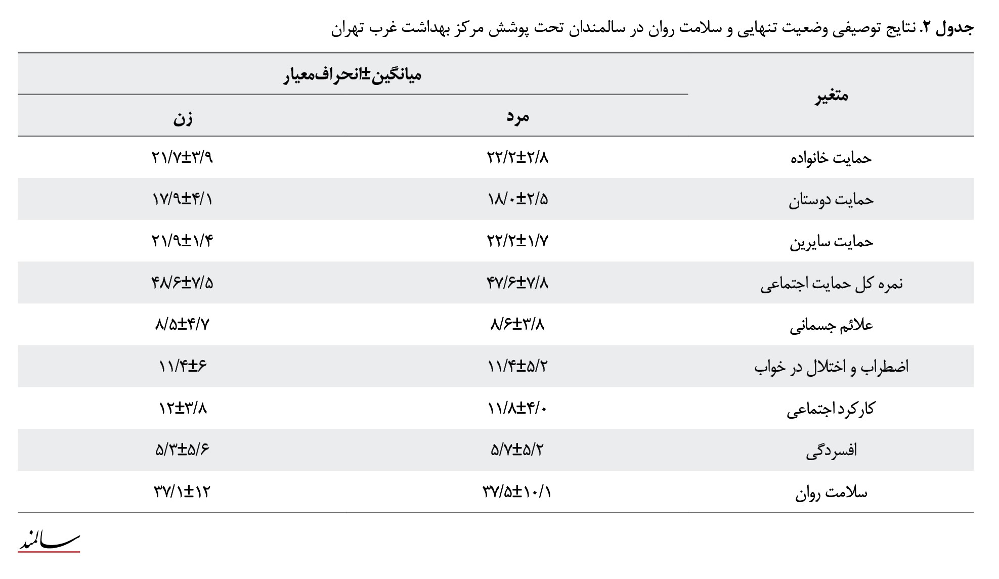لیو و همکاران، همچنین آقاجانی و همکاران توانستند اثر احساس تنهایی بر سلامت روان سالمندان را از طریق متغیر میانجی حمایت اجتماعی به دست آورند [53، 54]. گون و همکاران با مطالعه بر روی تعداد 837 نفر از سالمندان آمریکایی- افریقایی دریافتند که ارتباط خانوادگی و ارتباط با دوستان و آشنایان از جمله عوامل منحصربهفرد مؤثر بر سلامت روان این افراد است [55]. همچنین با استفاده از آزمون آنووا بین سلامت روان سالمندان موردمطالعه با نوع شغل، وضعیت تأهل و وضعیت اقتصادی ارتباط معنیداری مشاهده شد. مقدم و همکاران در مطالعه خود بر روی سالمندان شهر یزد اعلام کردند بین سلامت روان افراد سالمند با شغل و وضعیت تأهل و وضعیت درآمد آن ارتباط معنیداری وجود داشت [56].