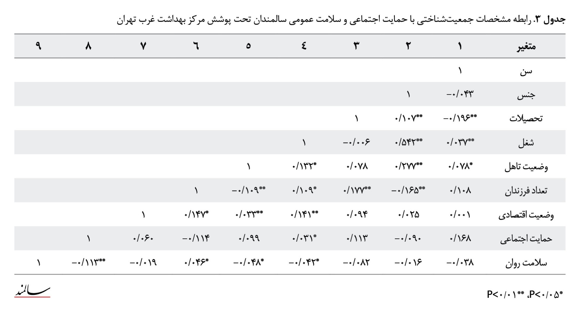 نتایج آزمون همبستگی پیرسون و تی مستقل در جدول شماره 3 نشان میدهد که بعضی از مشخصات جمعیتشناختی با نمره کل حمایت اجتماعی و سلامت روان سالمندان رابطه معناداری دارد (0/05>P).