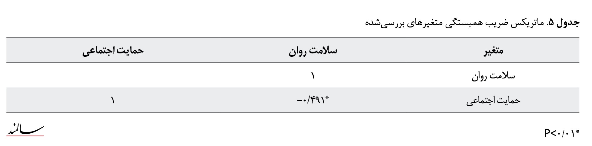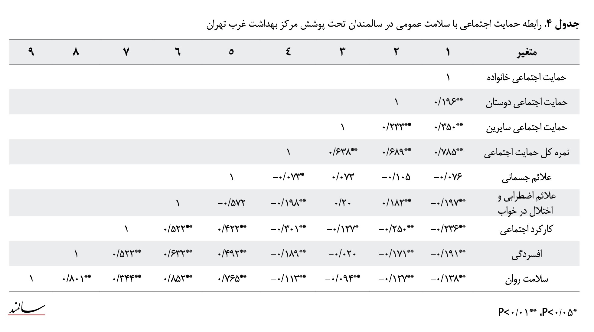 همچنین بین سلامت روان با حمایت اجتماعی سالمندان همبستگی منفی و معناداری مشاهده میشود (0/01>P).