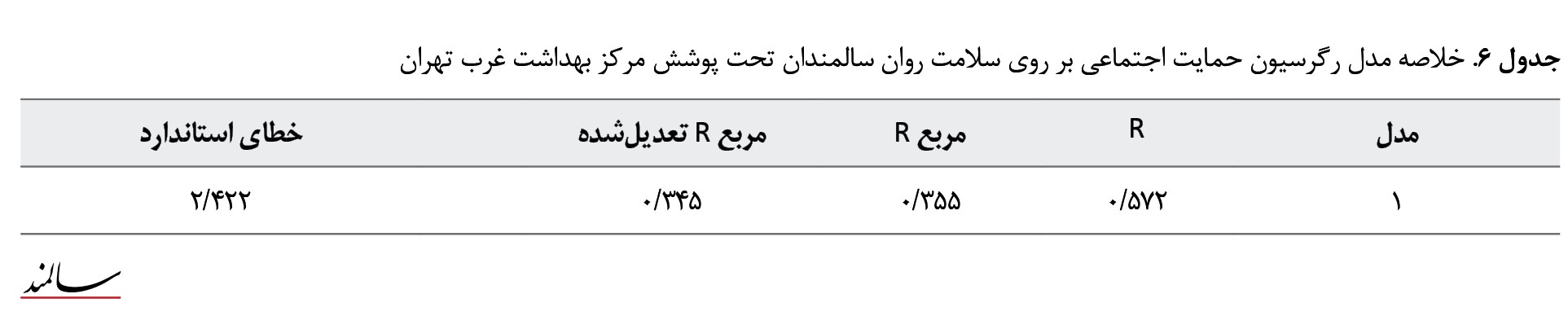 بهعبارتی نمره حمایت اجتماعی آشنایان بهجز خانواده و دوستان از سالمندان (0/287-=B و 0/001>P) و نمره کل حمایت اجتماعی (0/466-=B و 0/004=P) با نمره کل سلامت روان سالمندان همبستگی منفی و معنیداری دارد. علاوهبراین با کاهش یک واحد در نمره کل حمایت اجتماعی، میانگین نمره سلامت روان 9/30 درصد افزایش مییابد و هرچه این نمره بالاتر باشد، نشاندهنده ناهنجاری بیشتر در سلامت روان سالمندان است (جدول شماره 6).