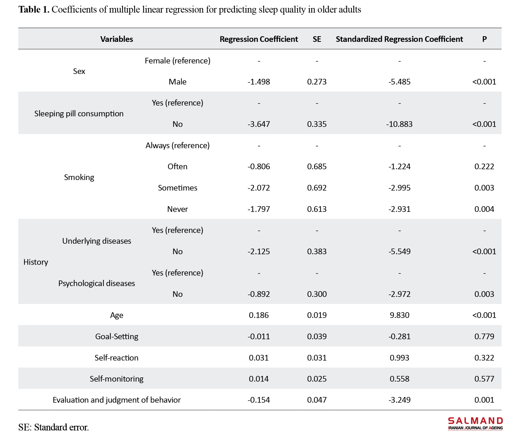 Based on the results of the univariate linear regression, behavior evaluation and judgment (P<0.001), goal setting (P=0.001), and self-monitoring (P=0.009) were the most effective predictors of sleep quality in older adults. Based on the results of multiple regression, non-use of sleeping pills (β=-10.883, P<0.001), age (β=9.830, P<0.001), no history of underlying disease (β=-5.549, P<0.001), male gender (β=-5.485, P<0.001), behavior evaluation and judgment (β=-3.249, P<0.001), no history of psychological diseases (β=-2.972, P=0.003) and non-smoking (β=-2.931, P=0.004) were predictors of sleep quality (Table 1).