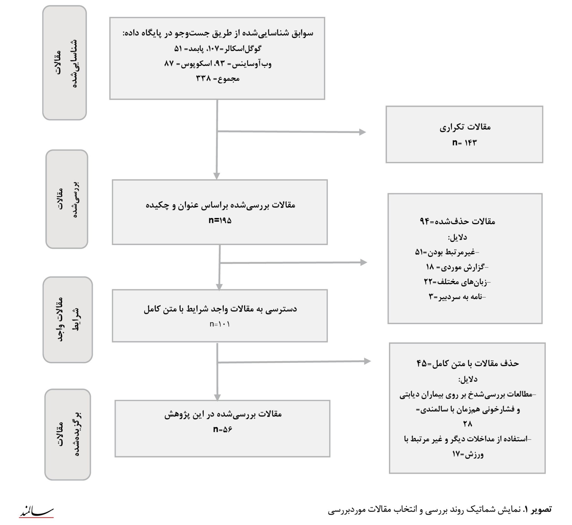 با رعایت اصول و موضوعات استاندارد مقالات بررسیشده، پژوهش حاضر با بررسی 56 مقاله واجد شرایط انجام شد (