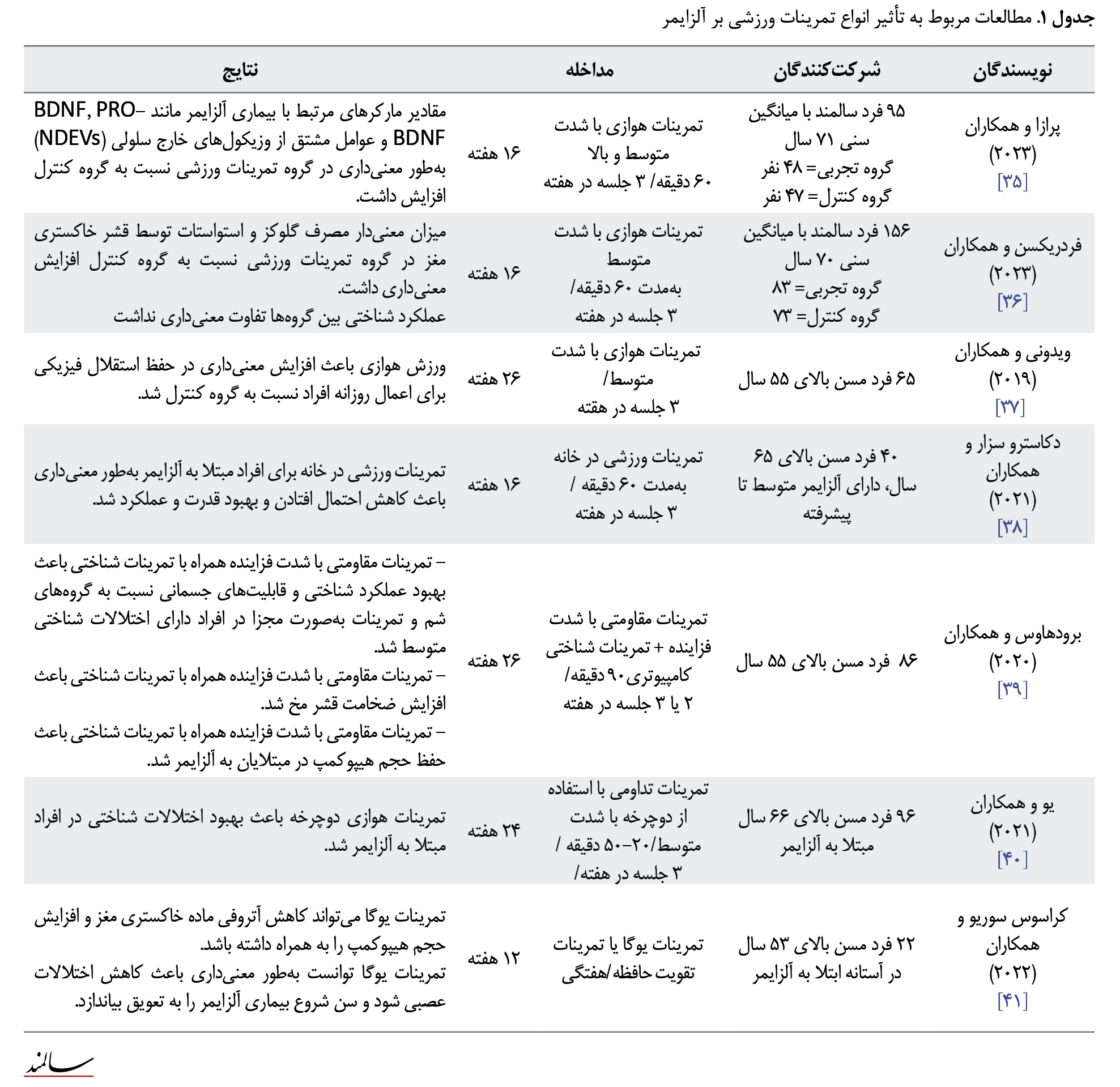 سیلوا و همکاران در مطالعهای به بررسی تغییرات مهمترین مارکرهای مؤثر در بیماری آلزایمر و سالمندی پرداختند که در این مطالعه به بررسی تأثیر تمرینات هوازی با شدت بالا با وزن بدن بر مقادیر مارکرهای BDNF و Phosphorylated-TAU پرداخته شد و درنهایت مشخص شد انجام تمرینات با شدت بالا باعث افزایش معنیداری در مقادیر این عوامل و بهبود عملکرد حرکتی بیماران سالمند دچار آلزایمر شد [33]، درحالیکه اخیراً مطالعات نشان دادهاند تمرینات هوازی همراه با مهارتهای شناختی، تأثیرات مهاری بیشتری بر اختلالات ناشی از آلزایمر در افراد بالای 65 سال داشتهاند [34].