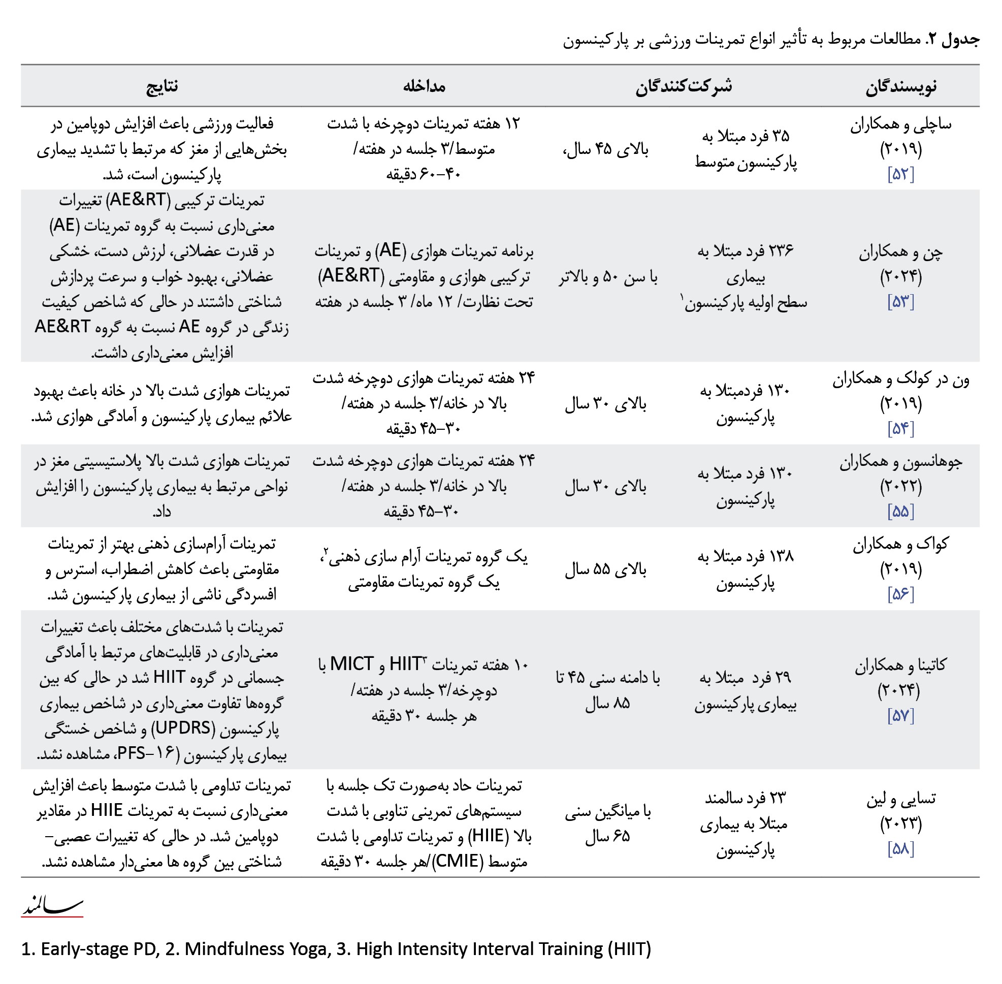 همچنین، دررابطهبا تأثیر انواع مختلف تمرینات ورزشی بر روی بیماری پارکینسون در دوران سالمندی در تحقیقی به بررسی تأثیر تمرینات مقاومتی و تمرینات تناوبی با شدت بالا بر روی بیماری پارکینسون در افراد سالمند پرداخته شد که درنهایت گزارش شد انجام هر دو نوع تمرینات HIIT و تمرینات مقاومتی، باعث بهبود عملکرد حرکتی و شناختی افراد سالمند دارای علائم بیماری پارکینسون شد؛ درنهایت پس از ارزیابی جامع مطالعات در این زمینه مشخص شد انجام تمرینات تناوبی با شدت بالا همراه با تمرینات مقاومتی دارای تأثیرات همافزایی (سینرژیک) بودند و باعث تغییرات بیشتر نسبت به هر کدام از این نوع تمرینات بهصورت مجزا شدند [49].