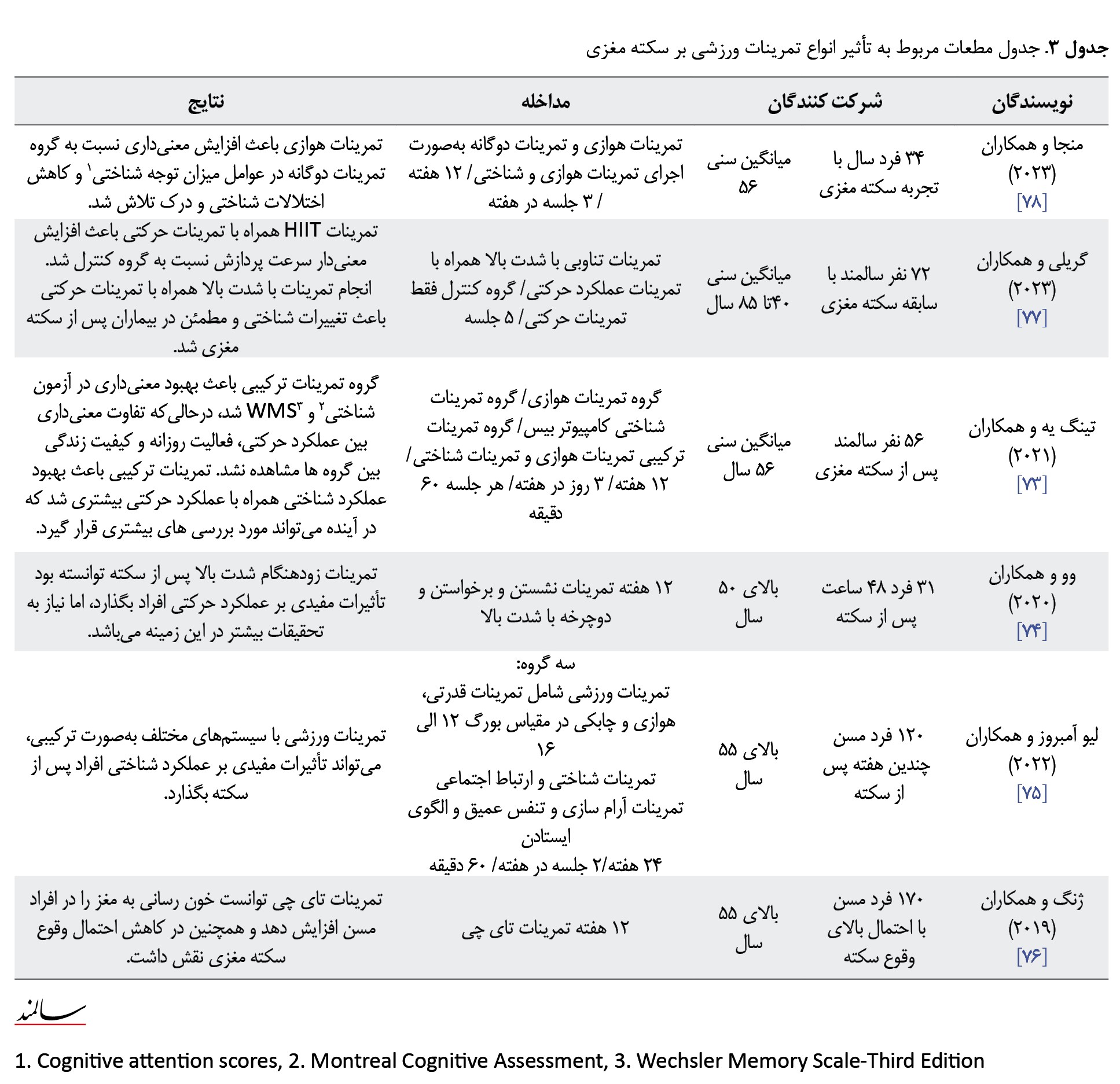 نتایج این مطالعه مروری بهمنظور ایجاد یک چشمانداز جامع در مورد اثرات ورزش بر پیری مغز و نقش آن در پیشگیری و درمان تحلیل و تفسیر شدهاند که در این بخش به شناسایی شکافهای موجود در تحقیقات و پیشنهادهایی برای تحقیقات آتی نیز پرداخته شد [7].