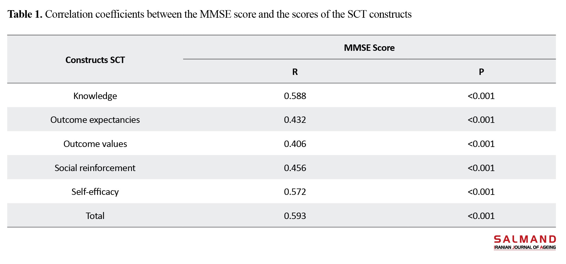 There was a significant and direct correlation between the MMSE score and all SCT constructs (P<0.001). With the increase in each of the SCT constructs, the mean MMSE score increases (