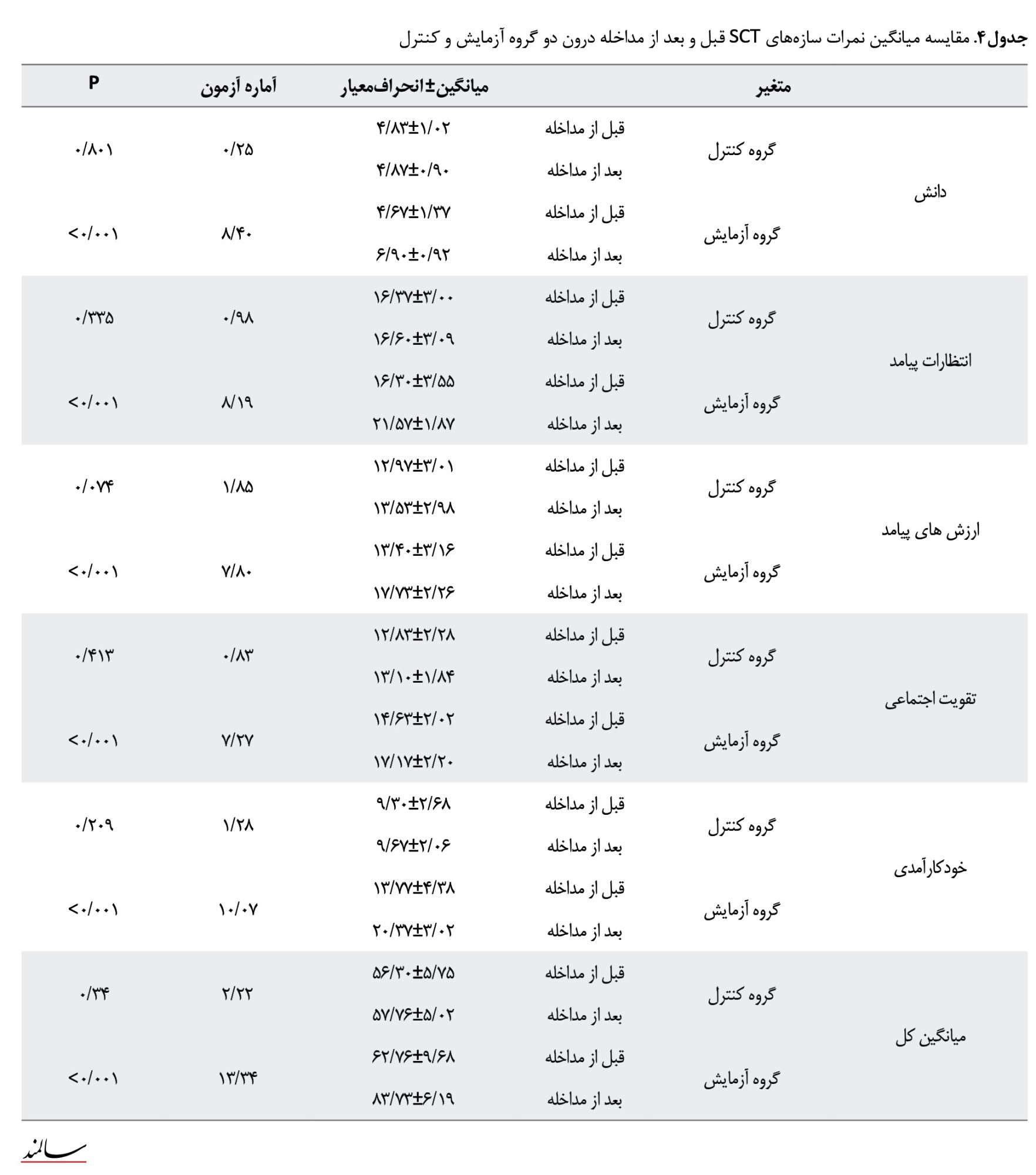 در مقایسه میانگین نمرات سازههای SCT قبل و بعد از مداخله درون دو گروه آزمون و کنترل، با استفاده از تحلیل تی زوجی نشان داده شد، هرچند در هیچکدام از سازههای موردنظر، در گروه کنترل، بین میانگین نمره قبل و بعد از مداخله هیچ اختلاف معنیداری وجود ندارد (0/05<