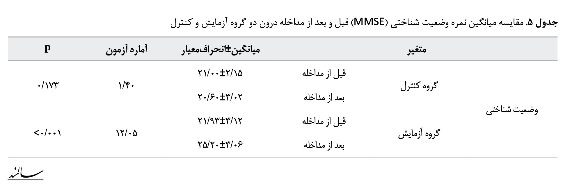 در مقایسه میانگین نمره وضعیت شناختی (MMSE) قبل و بعد از مداخله درون دو گروه آزمون و کنترل، مقایسه میانگین نمره وضعیت شناختی (MMSE) قبل و بعد از مداخله درون دو گروه آزمون و کنترل را با استفاده از تحلیل تی زوجی نشان میدهد. براساس یافتهها هر چند در گروه کنترل، هیچ اختلاف معنیداری بین میانگین نمره قبل و بعد از مداخله وجود نداشت (0/173=P)، در گروه مداخله، میانگین نمره بعد از مداخله نسبت به قبل از مداخله، افزایش پیدا کرد که این اختلاف از نظر آماری معنیدار بود (0/001>P). (جدول شماره 5).