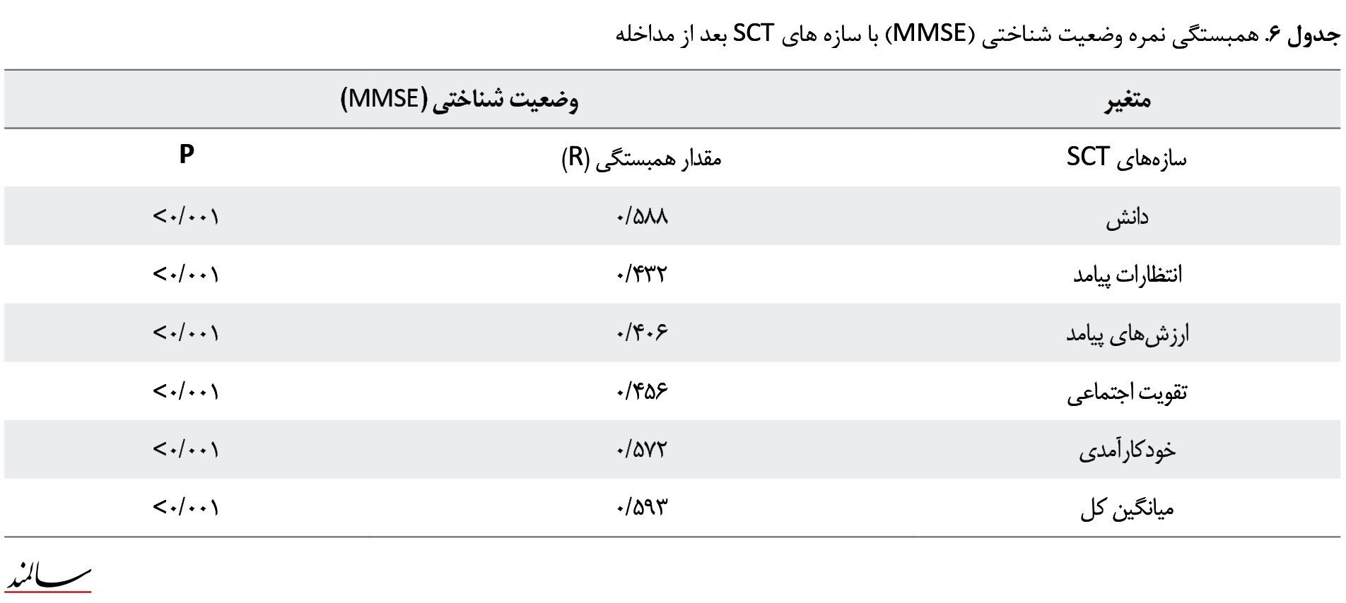 بین نمره وضعیت شناختی و تمام سازههای SCT ، همبستگی معنیدار و مستقیم وجود داشت. بدین منظور که با افزایش هر کدام از سازههای نظریه شناختی-اجتماعی، میانگین نمره وضعیت شناختی نیز افزایش پیدا میکرد که این همبستگی از نظر آماری معنیدار بود (0/001>P). بالاترین همبستگی بین میانگین کل سازههای SCT با وضعیت شناختی (MMSE) بود (0/593=r) و کمترین همبستگی مربوط به ارتباط بین ارزشهای پیامد و وضعیت شناختی بود (0/406=r) (جدول شماره 6).