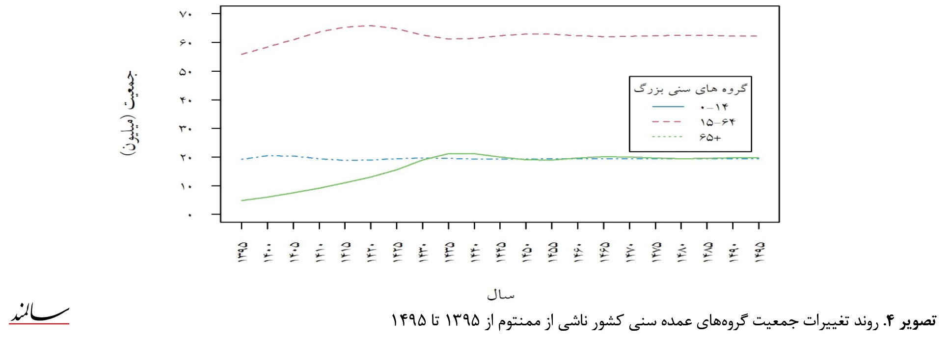 طبق تصویر درحالیکه در سال 1395 جمعیت گروه سنی زیر 15 سال حدود 19 میلیون نفر بود تا 1495 در حدود 20 میلیون نفر افزایش اندکی دارد. گروه سنی 15 تا 64 سال از حدود 56 میلیون در سال 1395 تا سال 1420 افزایش مییابد و در سال 1420 به حداکثر مقدار خود یعنی 66 میلیون میرسد، بعد از آن تا سال 1435 تا 61 میلیون کاهش مییابد و در ادامه تا سال 1495 در همین حدود باقی میماند. گروه سنی 65 سال و بالاتر از حدود 5 میلیون در سال 1395تا سال1440 به اوج مقدار خود یعنی 21 میلیون نفر میرسد. بعد از آن تا سال 1495 مجدداً با نوسانات کوچکی تا 19 میلیون کاهش مییابد. این در حالی است که کل جمعیت کشور از حدود 80 میلیون در سال 1395 تا سال 1440 به حدود 101 میلیون نفر میرسد و بعد از آن تا پایان دوره در همین حدود ایستا میشود. بر این اساس درحالیکه در سال 1395، 24 درصد جمعیت کشور را زیر 15سالهها تشکیل میدهند، این سهم تا 1495 به حدود 19 درصد میرسد. در مقابل، جمعیت 65 ساله و بیشتر از 6 درصد در سال 1395 تا 21 درصد در سال 1440 همواره افزایش دارد و بعد از آن تا سال 1495 در حدود 20 درصد باقی میماند.