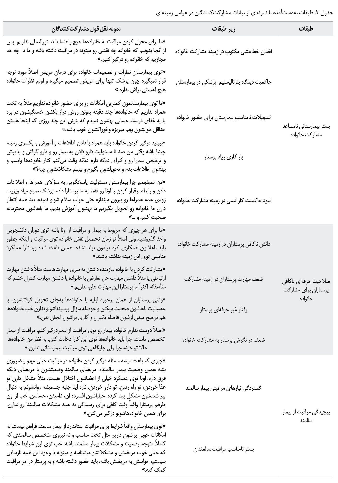 جدول شماره 2 زیرطبقات مربوط به این طبقات را همراه با نمونه بیانات مشارکتکنندگان توضیح میدهد.