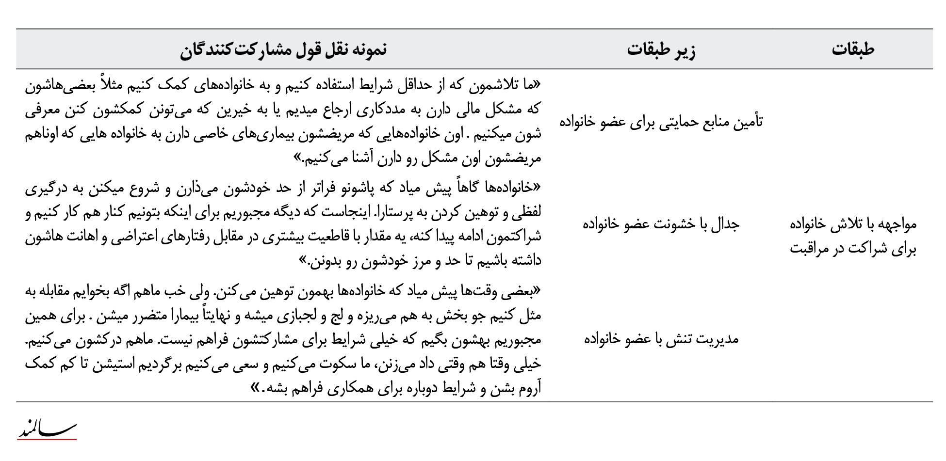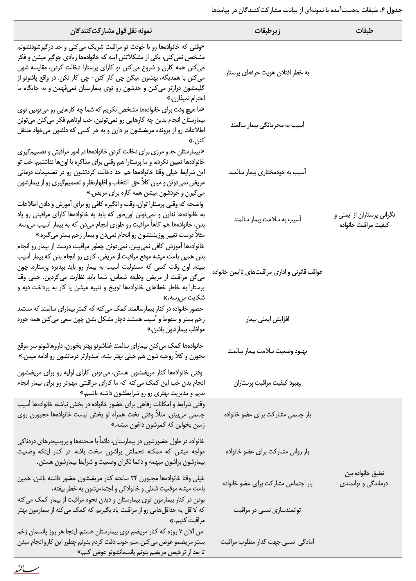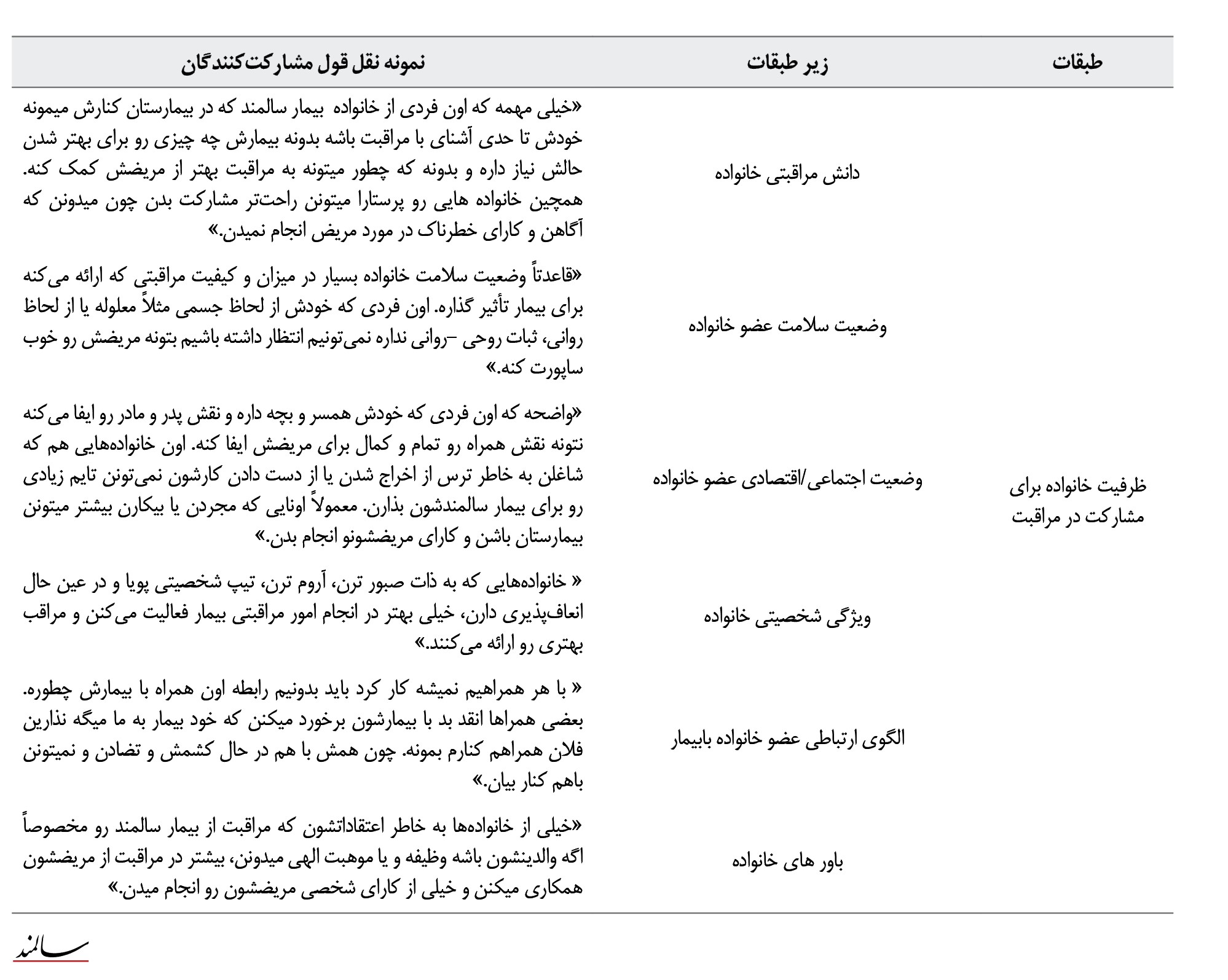 جدول شماره 3 زیرطبقات مربوط به این طبقات را همراه با نمونه بیانات مشارکتکنندگان توضیح میدهد. پرستاران تحت تأثیر عوامل زمینهای درجات و سطوح مختلفی از مشارکت دادن خانواده در مراقبت را انجام میدهند.