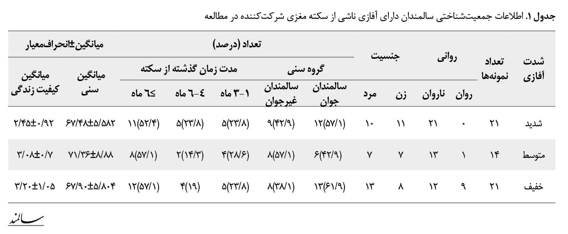 در این مطالعه در مجموع 56 فرد 60 سال و بالاتر مبتلا به آفازی ناشی از سکته مغزی با میانگین سنی 68/61 سال و انحرافمعیار 6/695 شرکت داشتند (44/6 درصد آنها را سالمندان جوان و 4/55 درصد از آنها را سالمندان غیرجوان) که 3/6 درصد از آنان را مردان و 46/4 درصد را زنان تشکیل دادند. میانگین شدت آفازی در این افراد 59/717 با انحرافمعیار 21/854 بود؛ میانگین مدتزمان گذشته از سکته 18/30 با انحرافمعیار 26/682 و بازه 1-120 ماه بود که 44/6 درصد از آنها در دوره تحت حاد (25 درصد تحت حاد زودهنگام و 19/6 درصد تحت حاد دیرهنگام) و 55/4 درصد از آنها در دوره مزمن بیماری به سر میبردند (جدول شماره 1).