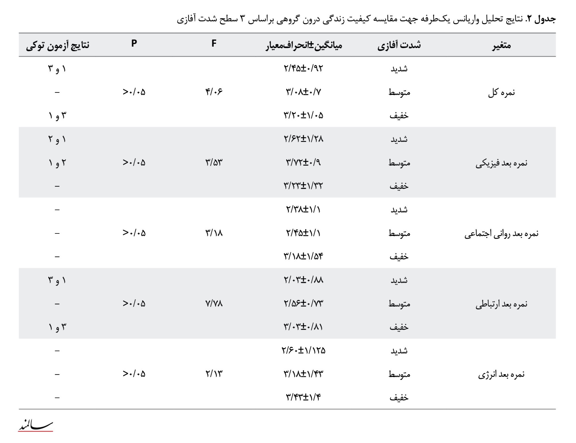 همانطورکه در جدول شماره 2 آمده است، نتایج آزمون یکطرفه آنووا نشان داد تفاوت معنیداری بین شدت آفازی و نمره کل کیفیت زندگی در سالمندان وجود دارد. بهمنظور مقایسه دوبهدوی گروهها از آزمون تعقیبی توکی استفاده شد.
