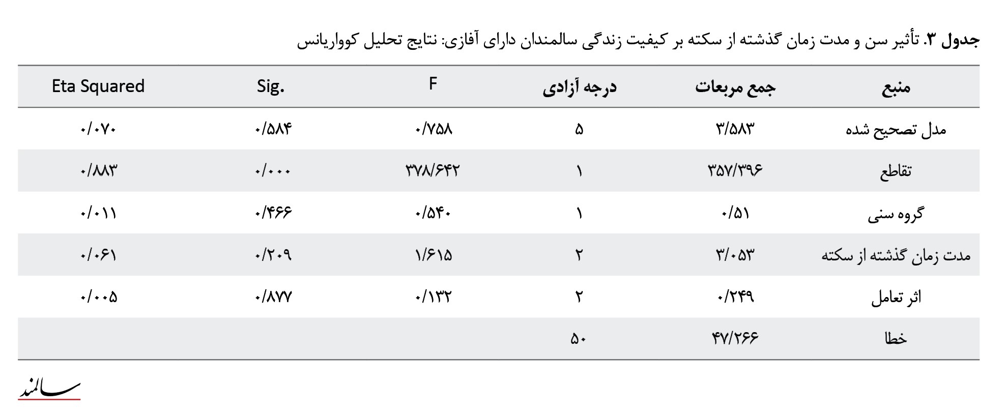 تحلیل کوواریانس بهمنظور بررسی تأثیر سن و مدتزمان گذشته از سکته بر کیفیت زندگی سالمندان مبتلا به آفازی انجام شد. نتایج نشان داد سن (0/466=P) و زمان گذشته از سکته (0/209=P) تأثیر معنیداری بر کیفیت زندگی ندارند. اندازه اثر نیز (0/07=Eta Squared) نشاندهنده اثر ناچیز این متغیرها بر کیفیت زندگی بوده و نتایج بیانگر عدم تأثیر معنیدار سن و مدت زمان گذشته از سکته در این نمونه میباشد (جدول شماره 3).