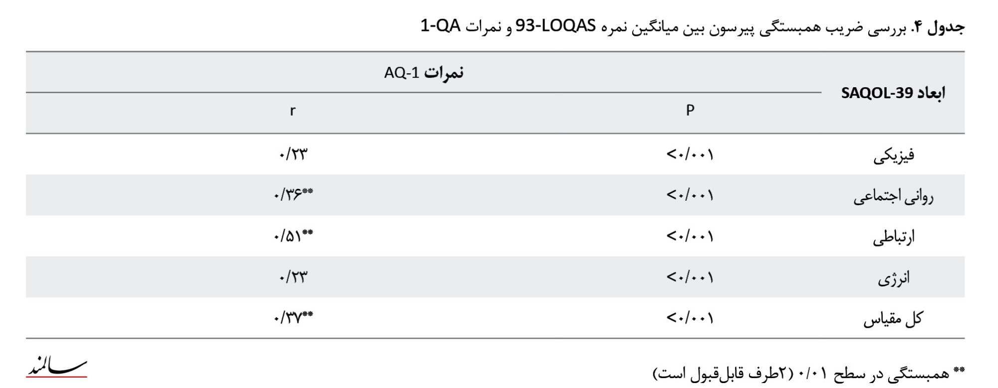 نتایج ضریب همبستگی پیرسون نیز نشان داد بین نمره بهره آفازی (AQ-1) و متغیرهای میانگین نمره کل و ابعاد کیفیت زندگی، رابطه آماری مثبت و معنیداری وجود دارد. ضریب همبستگی بین نمره AQ-1 و بعد ارتباطی قوی و بین AQ-1 و بقیه متوسط و ضعیف بود [46]. بهره آفازی با شدت آفازی فرق دارد و بهره آفازی بالاتر نشانگر شدت آفازی کمتر است (جدول شماره 4).