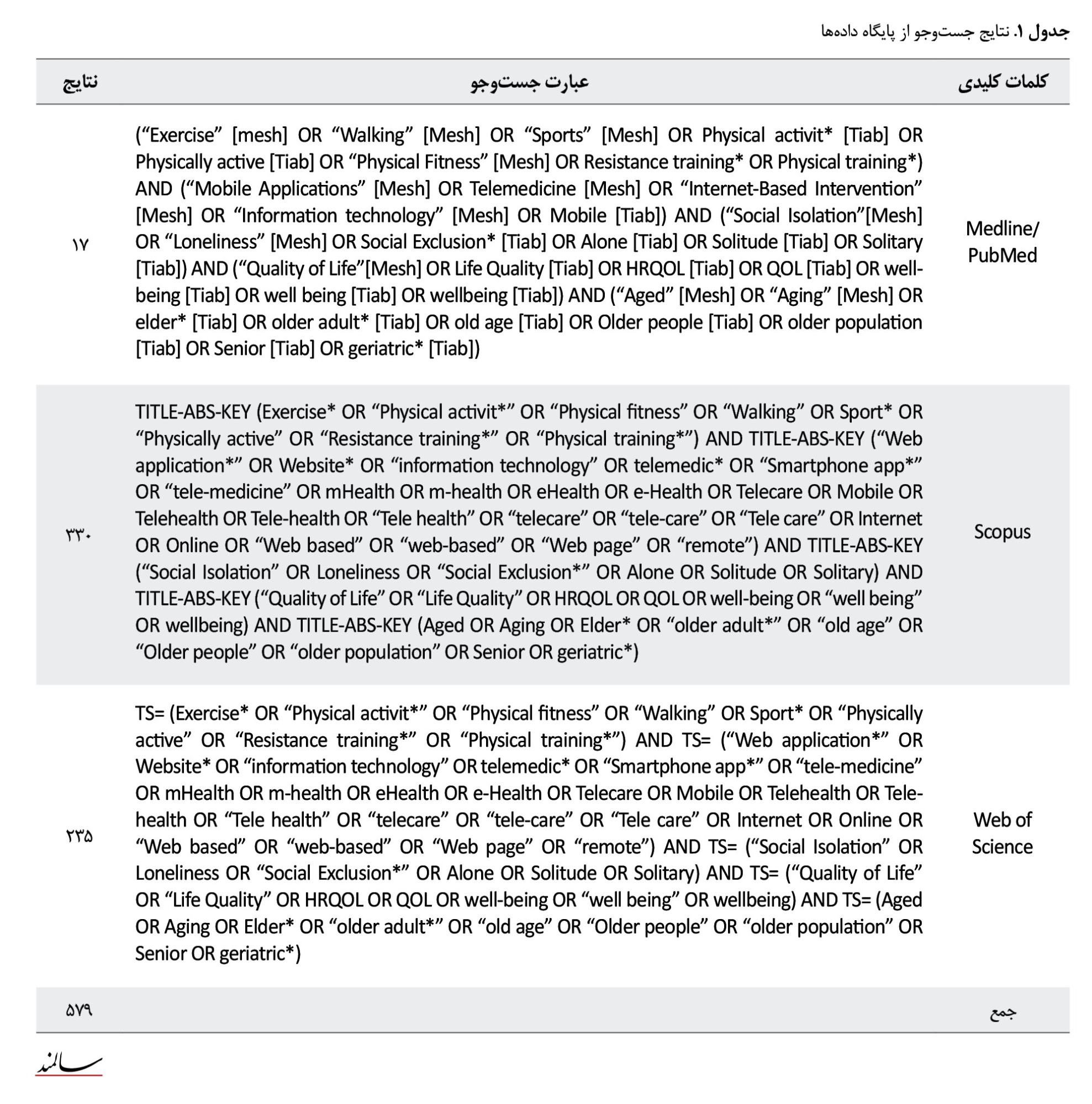 جستوجو تا تاریخ 10 تیرماه 1403 در پایگاههای اطلاعاتی اسکوپوس، پابمد و وبآوساینس انجام شد. هیچ فیلتر زمانیای اعمال نشد. موارد جستوجو در 5 دسته قرار گرفتند: ورزش: exercise، physical activities، sport و walking. مبتنی بر وب: web applications، Internet، Website، Telemedicine، Online، Mhealth، ehealth، web-based. انزوای اجتماعی: Social isolation، Loneliness، Social Exclusion. : کیفیت زندگی/ بهزیستی: Quality of Life، Life Quality، HRQOL، well-being. : سالمندان: Quality of Life، Life Quality، HRQOL، well-being. مقالات بازیابیشده به نسخه 20 نرمافزار EndNote منتقل شدند. جزئیات بیشتر درمورد موارد جستوجو و نتایج جستوجو در جدول شماره 1 ارائه شده است.