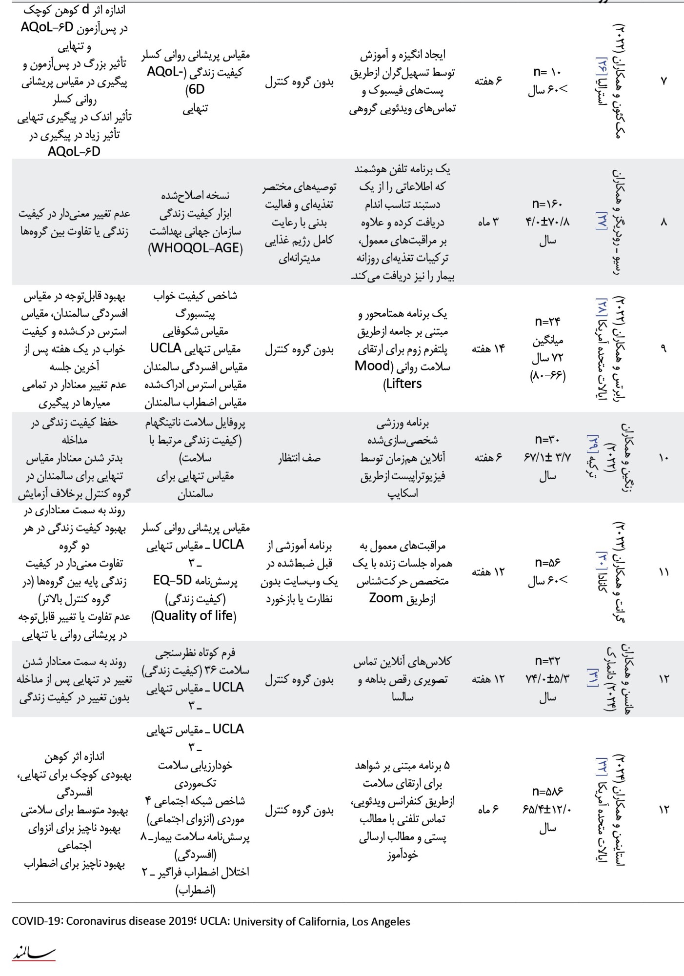 کیفیت زندگی با این دسته از مداخلات سیر متفاوتی داشت. کیفیت زندگی، همانطور که در نظریه 6 عاملی بهزیستی روانشناختی ریف [36] مطرح شده، یک مفهوم چندبعدی است که ابعاد مختلفی از عملکرد مثبت روانشناختی را دربر میگیرد، ازجمله خودپذیری، رشد شخصی، هدف در زندگی، روابط مثبت با دیگران، تسلط محیطی و خودمختاری [36]. ناهمگونی نتایج در مطالعات مختلف، میتواند ناشی از تأثیر متفاوت مداخلات بر این ابعاد چندگانه کیفیت زندگی باشد. بنابراین کیفیت زندگی یک اصطلاح کلی است که بهطور ناهمگون و در جنبههای مختلف به رضایت کلی که یک فرد یا گروهی از افراد در زندگی خود تجربه میکنند و به زیستن اشاره دارد [37]. این مطالعات از معیارهای مختلفی برای کیفیت زندگی استفاده کردند. ضمن اینکه، نامطلوبترین پیامد برای کیفیت زندگی در مطالعه داسیلوا مشاهده شد [24]. نویسندگان این مشاهدات را به انزوای ناشی از کووید ـ 19 نسبت دادند. همچنین این مطالعه بدون کنترل بود.