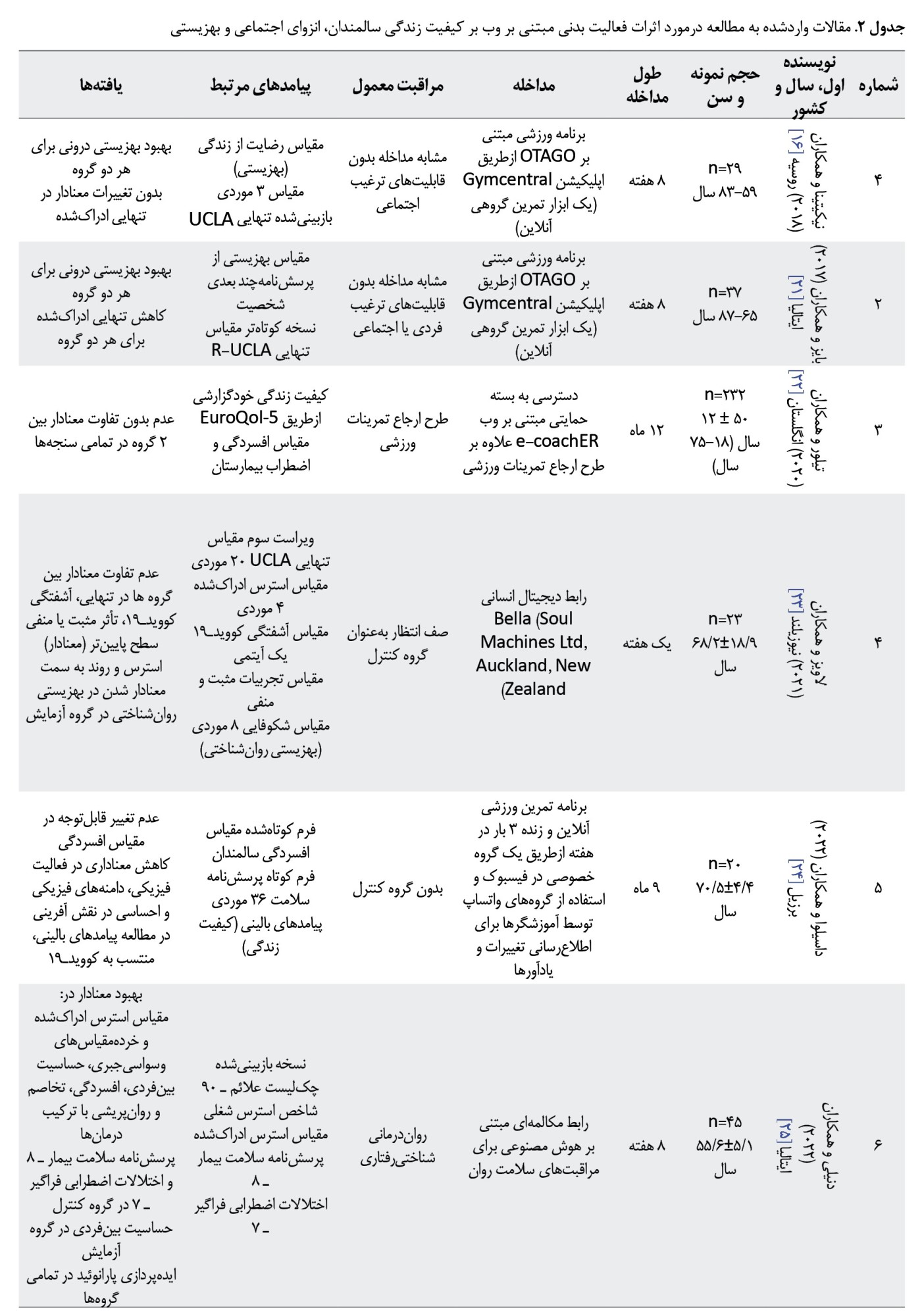 معیارهای خروج: مطالعاتی شامل شرکتکنندگان بستری در بیمارستان، خانههای سالمندان یا مراکز مراقبت طولانیمدت؛ مداخلاتی که فقط از تماسهای تلفنی صوتی استفاده میکردند؛ مطالعاتی کودکان یا نوجوانان را هدف قرار میدادند؛ مطالعاتی که در آن جمعیت هدف به دلیل برخی شرایط خاص (مانند دمانس، پارکینسون، سکته مغزی یا آسیب شدید فیزیکی و شناختی) انتخاب شده بودند و مطالعاتی که ارتباط پیامدهای گزارششده آنها با کیفیت زندگی، انزوای اجتماعی یا به زیستن روشن یا کافی نبود.