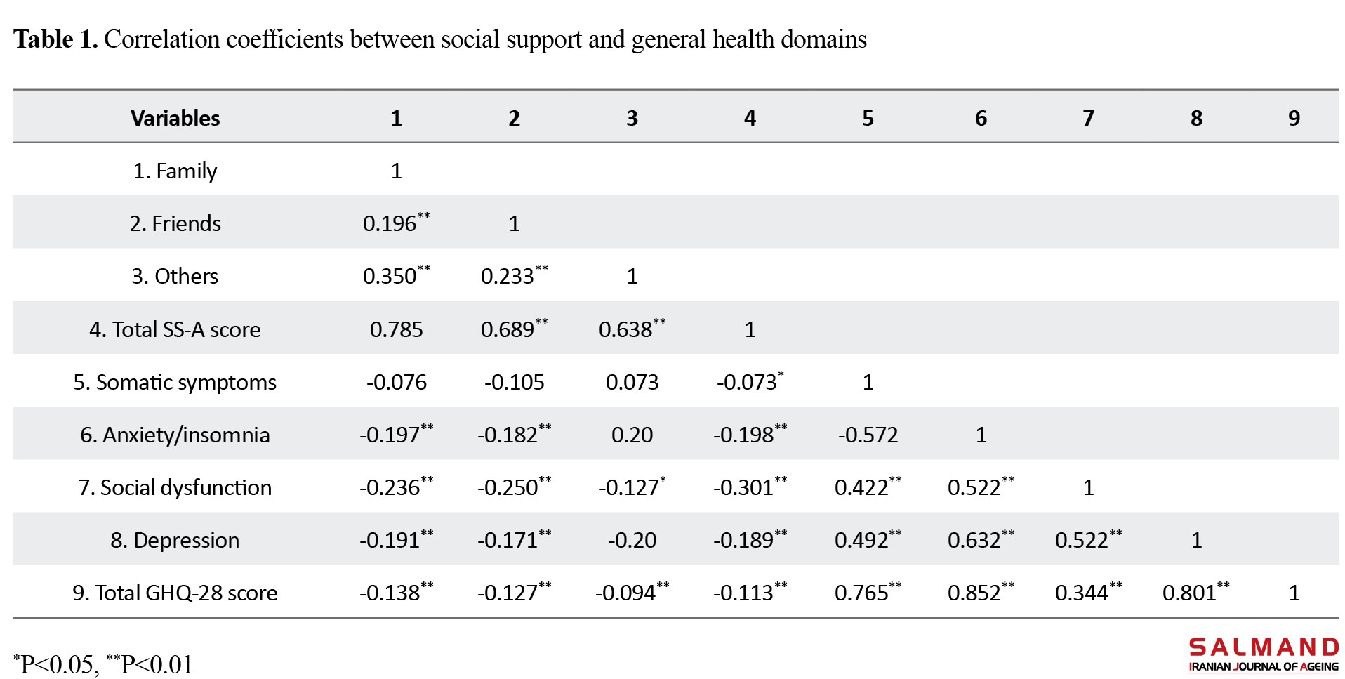 Aghajani T, Solhi M, Forughan M, Ezattifard A, Ghahremanzadeh N, Rezaei F et al . Relationship of Social Support With General Health Among Older Adults in the West of Tehran, Iran. Salmand: Iranian Journal of Ageing 2026; 20 (4) :578-593