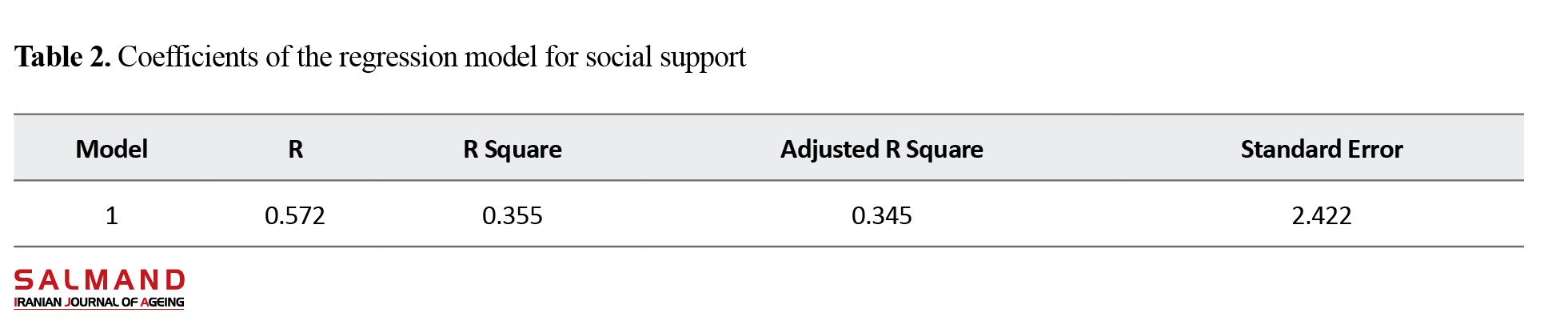 The results of the linear regression also showed that social support accounted for 50% of the changes in general health. In other words, the social support from others (β=0.287, P<0.001) and the total score of SS-A (β=-0.466, P=0.004) had a negative and significant correlation with the total score of GHQ-28. For one unit decrease in the total score of SS-A, the GHQ-28 score increases (worsens) by 34.5% (Table 2).
